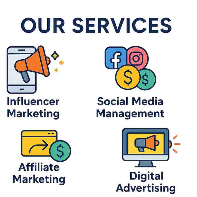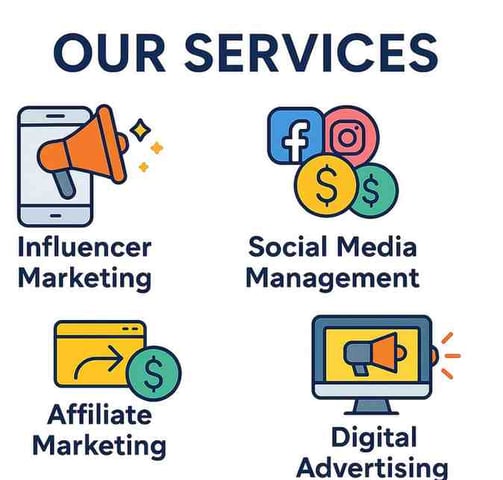 A clean graphic showing four key services: Influencer Marketing, Social Media Management, Affiliate Marketing, and Digital Advertising — each with bold icons and text on a white background.